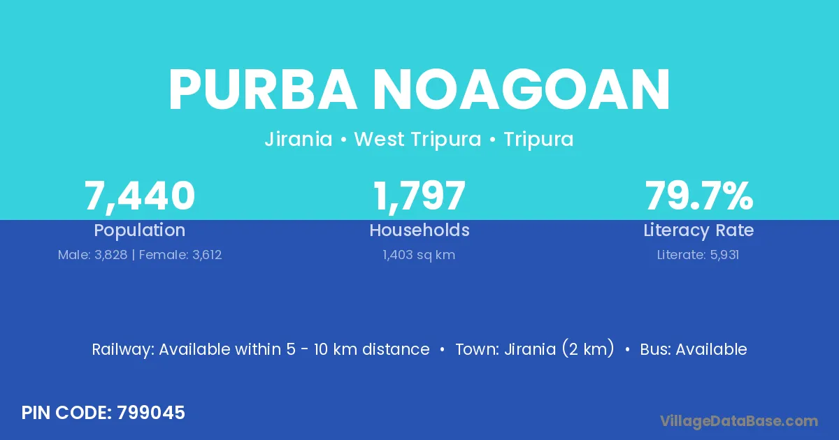Jirania (2 km) is the nearest town to Purba Noagoan village for major economic activities and is located approximately 2 km away.