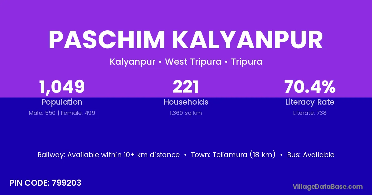 Teliamura (18 km) is the nearest town to Paschim Kalyanpur village for major economic activities and is located approximately 18 km away.