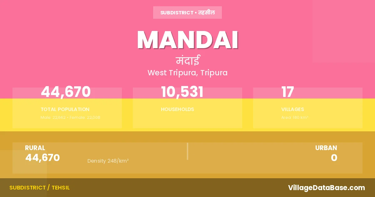Mandai is a town and Subdivision in the West Tripura district of the Tripura. In India, a Subdivision is a subdivision of a district responsible for the administration and revenue collection of a specific area within the district. Subdivisions play a crucial role in the local governance structure, contributing significantly to the development and administration of their communities.