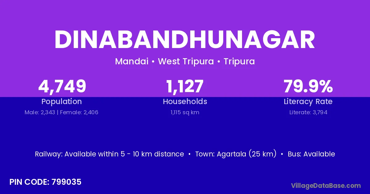 Agartala (25 km) is the nearest town to Dinabandhunagar village for major economic activities and is located approximately 25 km away.