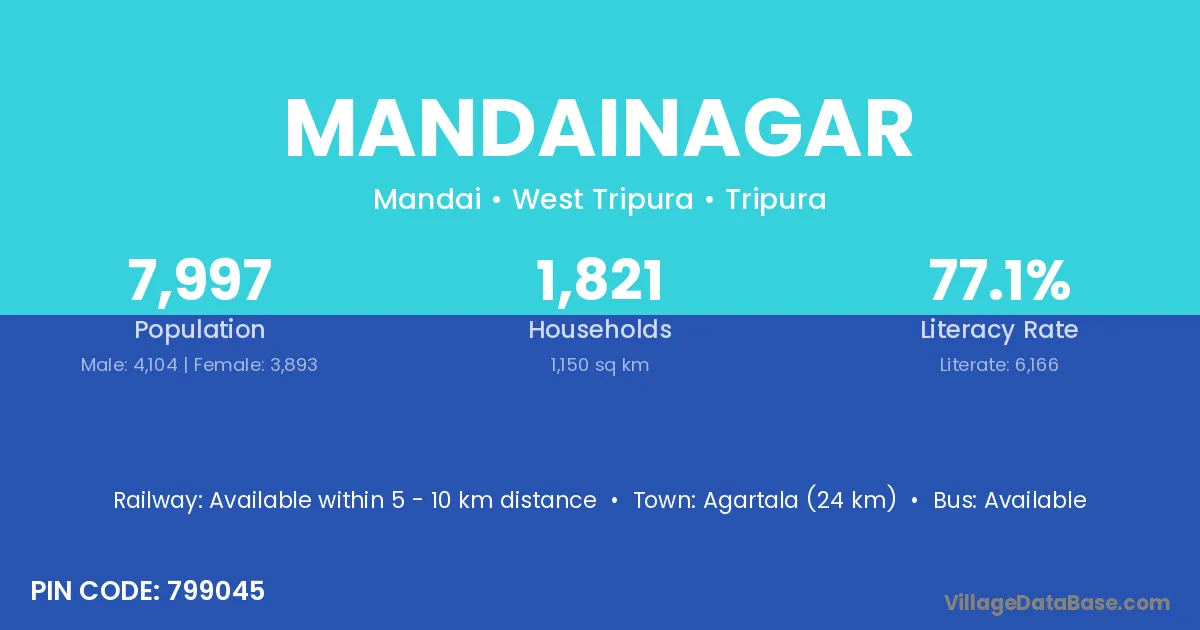 Agartala (24 km) is the nearest town to Mandainagar village for major economic activities and is located approximately 24 km away.
