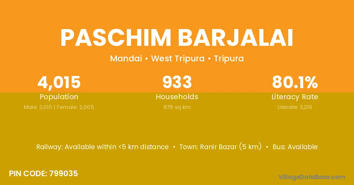 Paschim Barjalai village has a total population of 4,015 people, of which 2,010 are males and 2,005 are females.