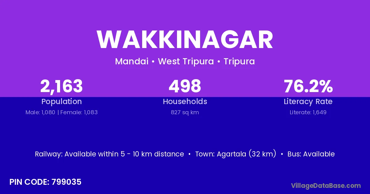 Agartala (32 km) is the nearest town to Wakkinagar village for major economic activities and is located approximately 32 km away.