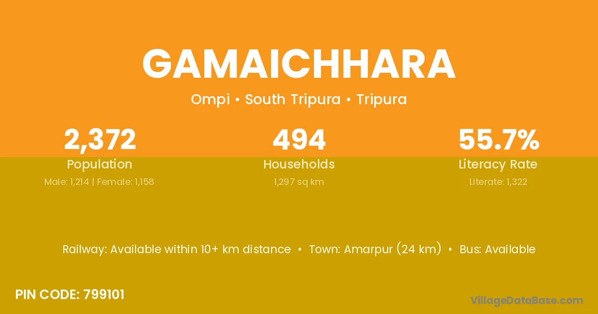 Sonamura (35 km) is the nearest town to Gamaichhara village for major economic activities and is located approximately 35 km away.