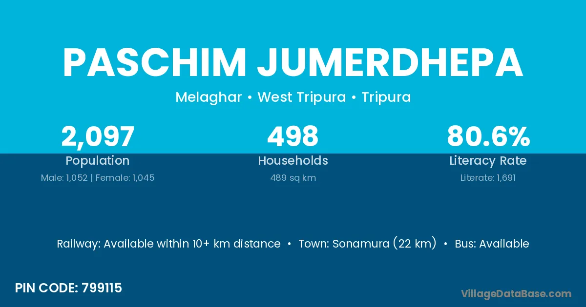 Sonamura (22 km) is the nearest town to Paschim Jumerdhepa village for major economic activities and is located approximately 22 km away.
