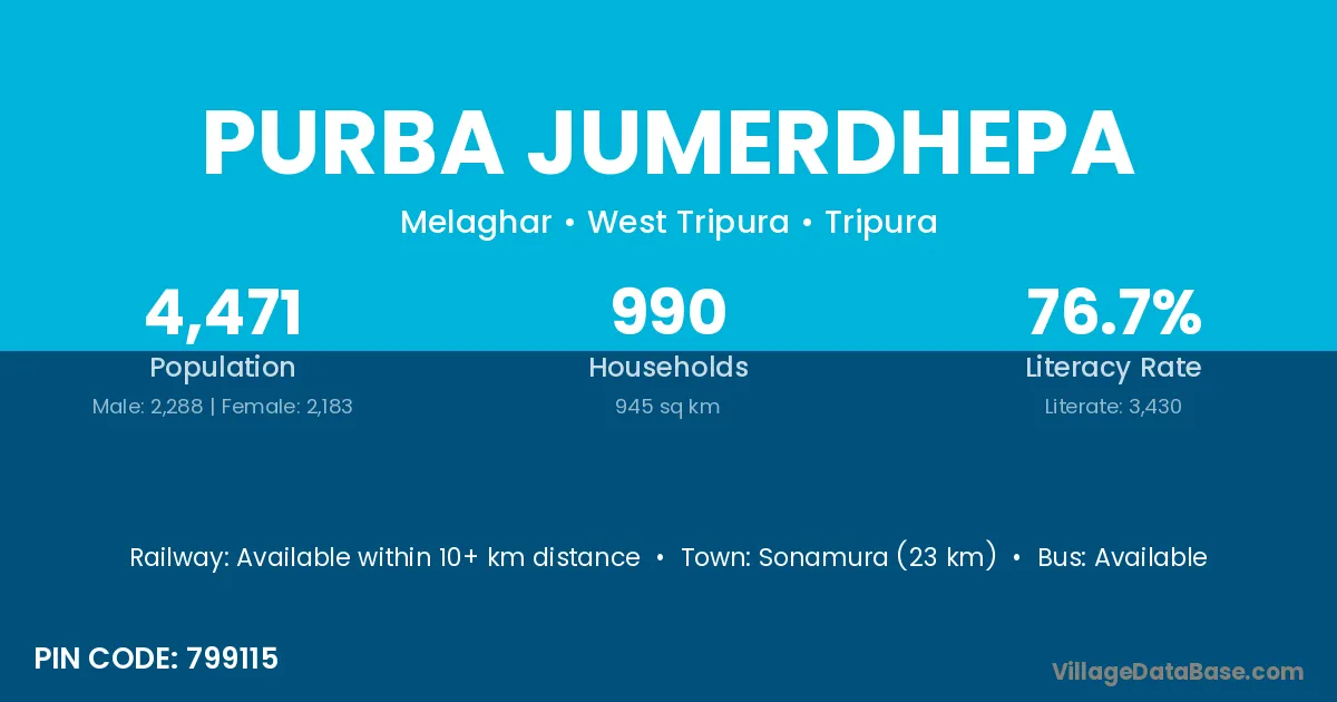 Sonamura (23 km) is the nearest town to Purba Jumerdhepa village for major economic activities and is located approximately 23 km away.