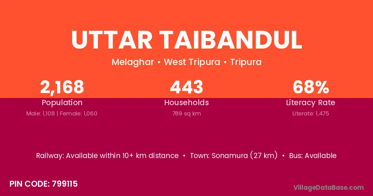 Sonamura (27 km) is the nearest town to Uttar Taibandul village for major economic activities and is located approximately 27 km away.