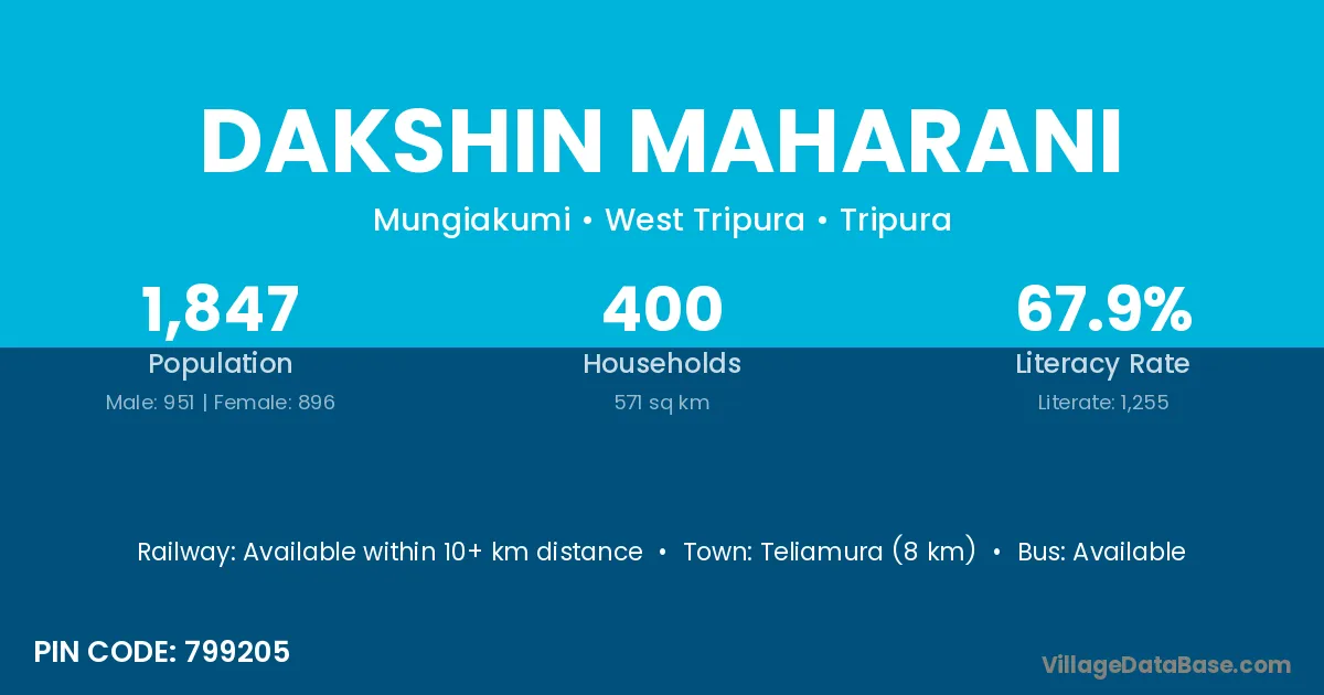 Teliamura (8 km) is the nearest town to Dakshin Maharani village for major economic activities and is located approximately 8 km away.