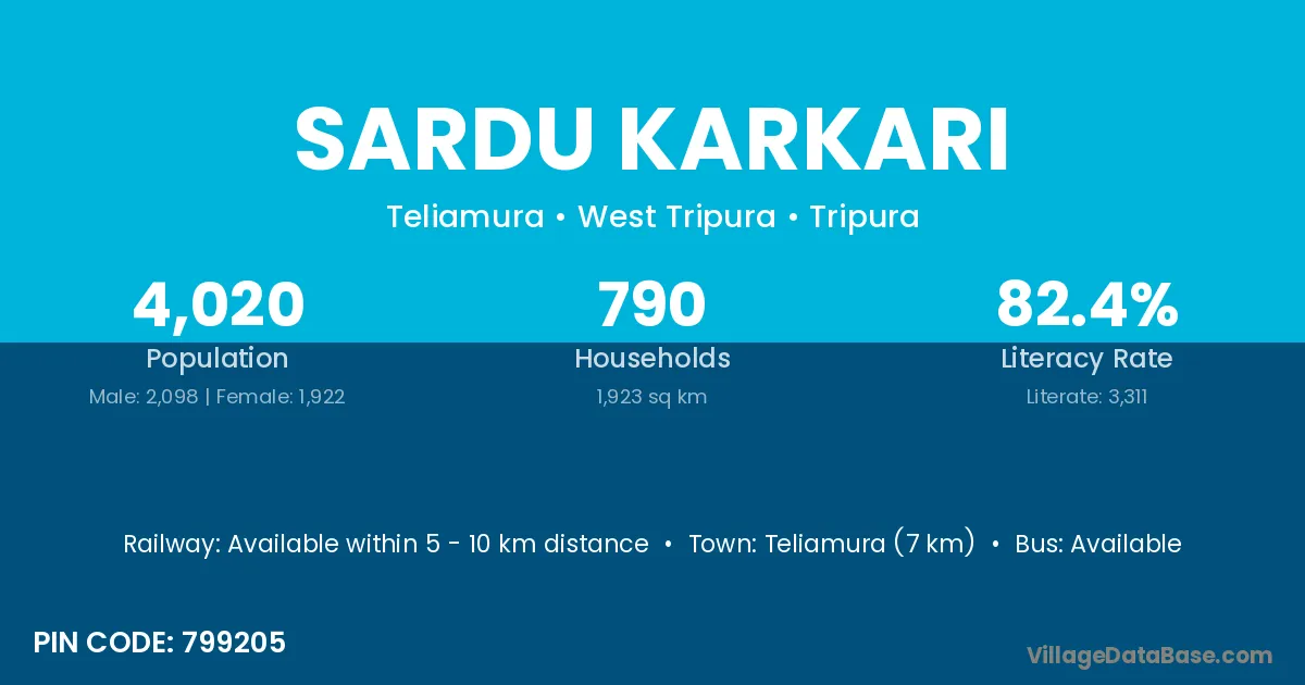 Teliamura (7 km) is the nearest town to Sardu Karkari village for major economic activities and is located approximately 7 km away.