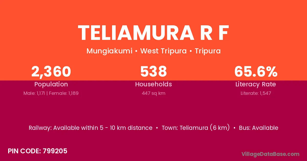 Teliamura (3 km) is the nearest town to Teliamura R F village for major economic activities and is located approximately 3 km away.