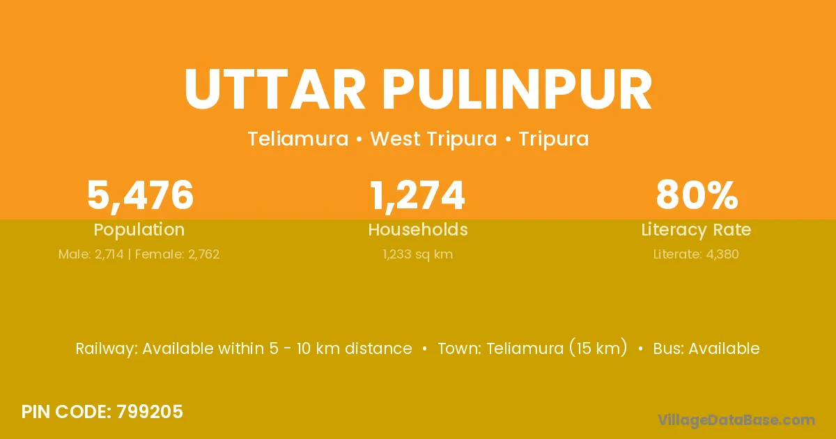 Teliamura (15 km) is the nearest town to Uttar Pulinpur village for major economic activities and is located approximately 15 km away.