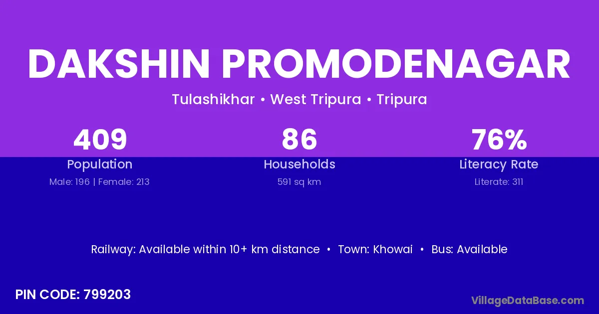 Dakshin Promodenagar village has a total population of 409 people, of which 196 are males and 213 are females.