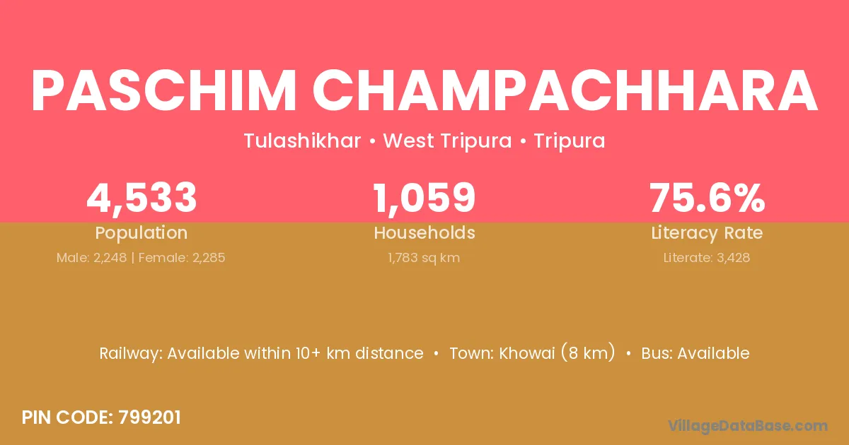 Khowai (8 km) is the nearest town to Paschim Champachhara village for major economic activities and is located approximately 8 km away.