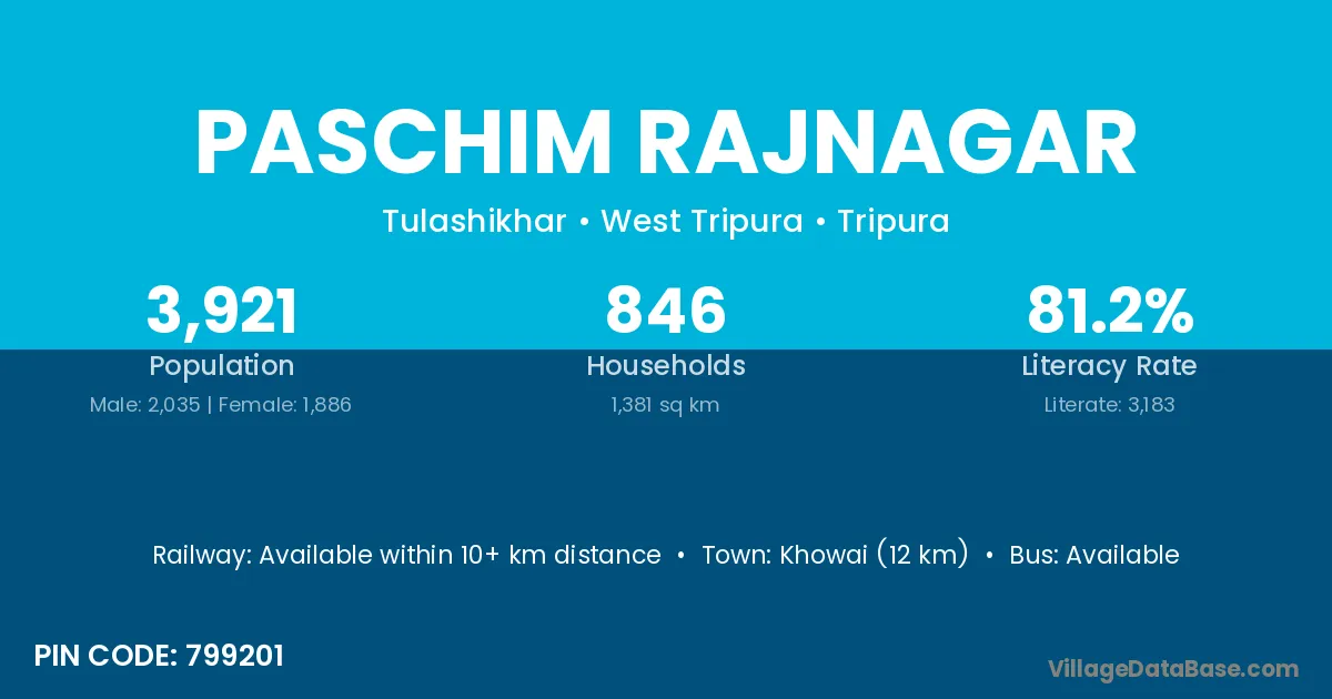 Khowai (12 km) is the nearest town to Paschim Rajnagar village for major economic activities and is located approximately 12 km away.