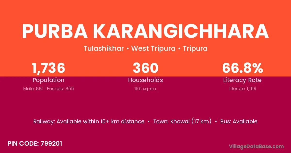 Khowai (17 km) is the nearest town to Purba Karangichhara village for major economic activities and is located approximately 17 km away.