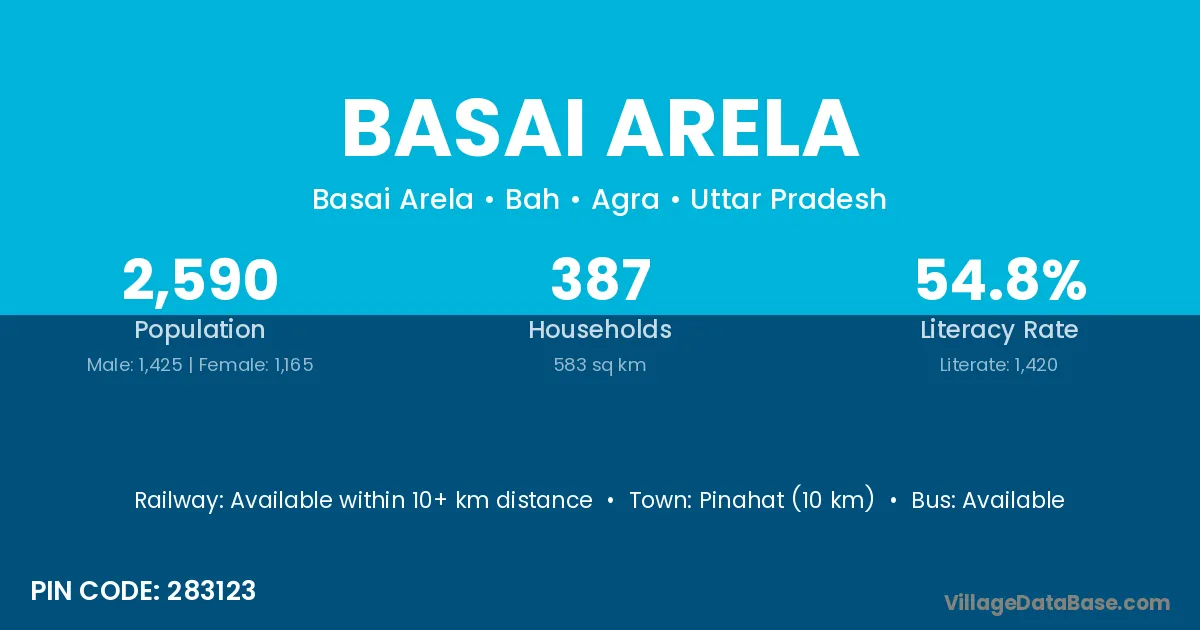 Pinahat (10 km) is the nearest town to Basai Arela village for major economic activities and is located approximately 10 km away.