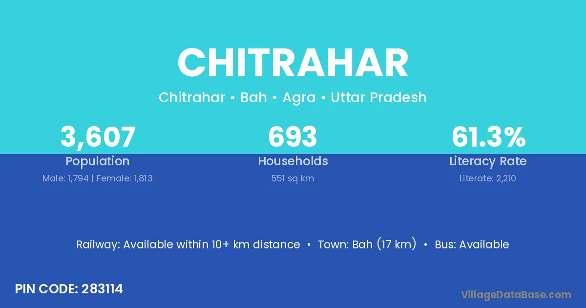 Bah (17 km) is the nearest town to Chitrahar village for major economic activities and is located approximately 17 km away.