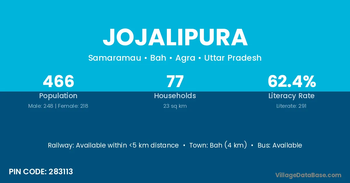 Bah (4 km) is the nearest town to Jojalipura village for major economic activities and is located approximately 4 km away.