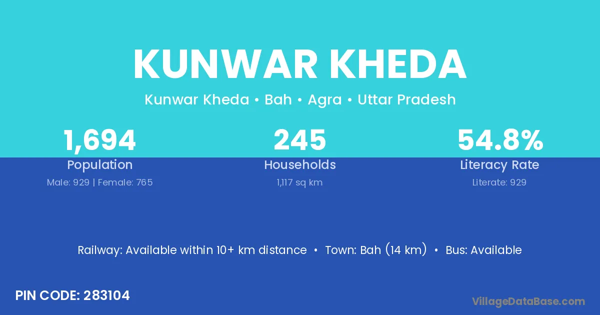 Bah (14 km) is the nearest town to Kunwar Kheda village for major economic activities and is located approximately 14 km away.