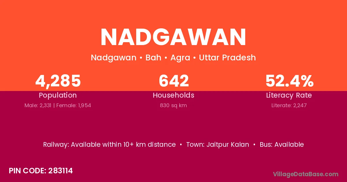 Nadgawan village has a total population of 4,285 people, of which 2,331 are males and 1,954 are females.