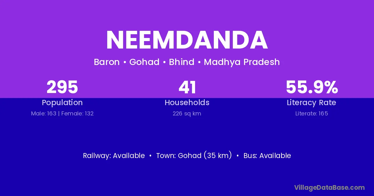 The literacy rate of Neemdanda village is 62.58%. Male literacy stands at 72.93% and female literacy at 50.52%.