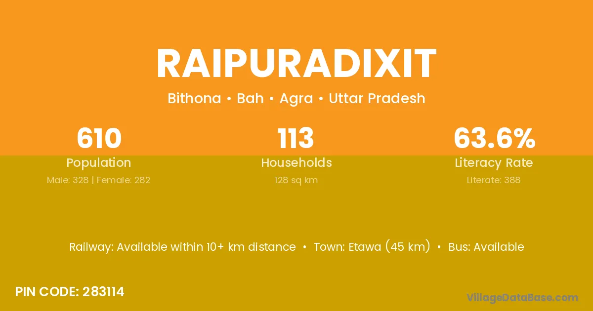 Etawa (45 km) is the nearest town to Raipuradixit village for major economic activities and is located approximately 45 km away.