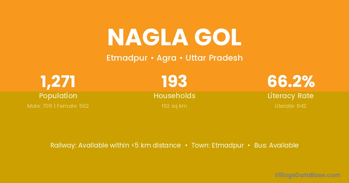 Nagla Gol village has a total population of 1,271 people, of which 709 are males and 562 are females.