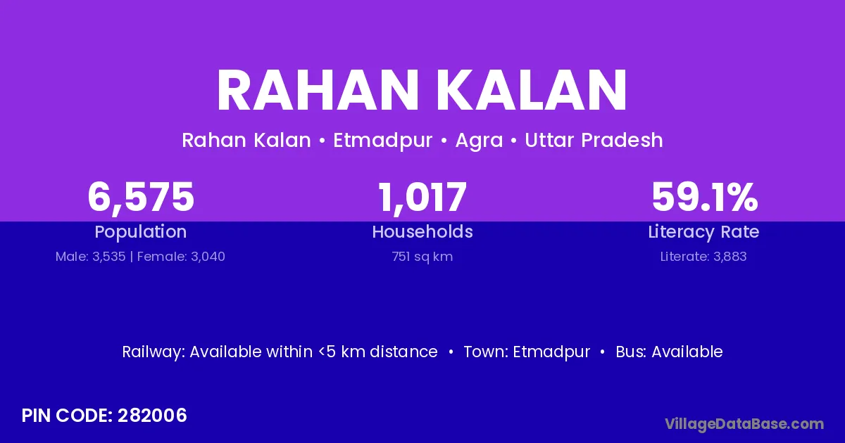 Etmadpur is the nearest town to Rahan Kalan village for major economic activities