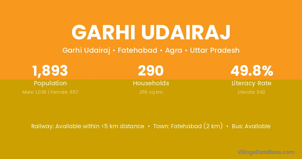 Garhi Udairaj village has a total population of 1,893 people, of which 1,036 are males and 857 are females.