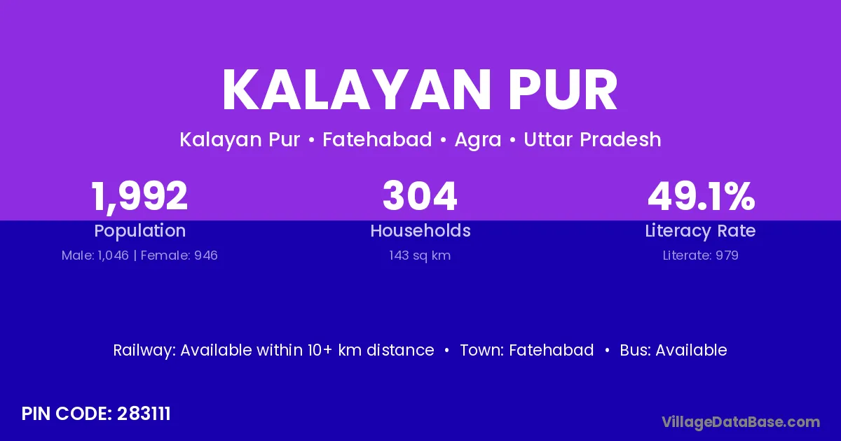 Kalayan Pur village has a total population of 1,992 people, of which 1,046 are males and 946 are females.
