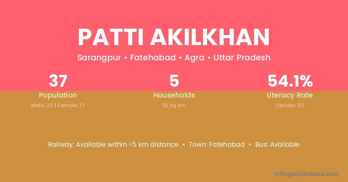 Patti Akilkhan village has a total population of 37 people, of which 20 are males and 17 are females.