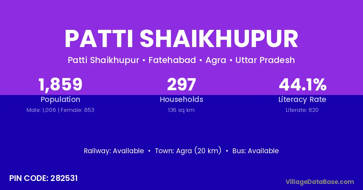 Agra (20 km) is the nearest town to Patti Shaikhupur village for major economic activities and is located approximately 20 km away.