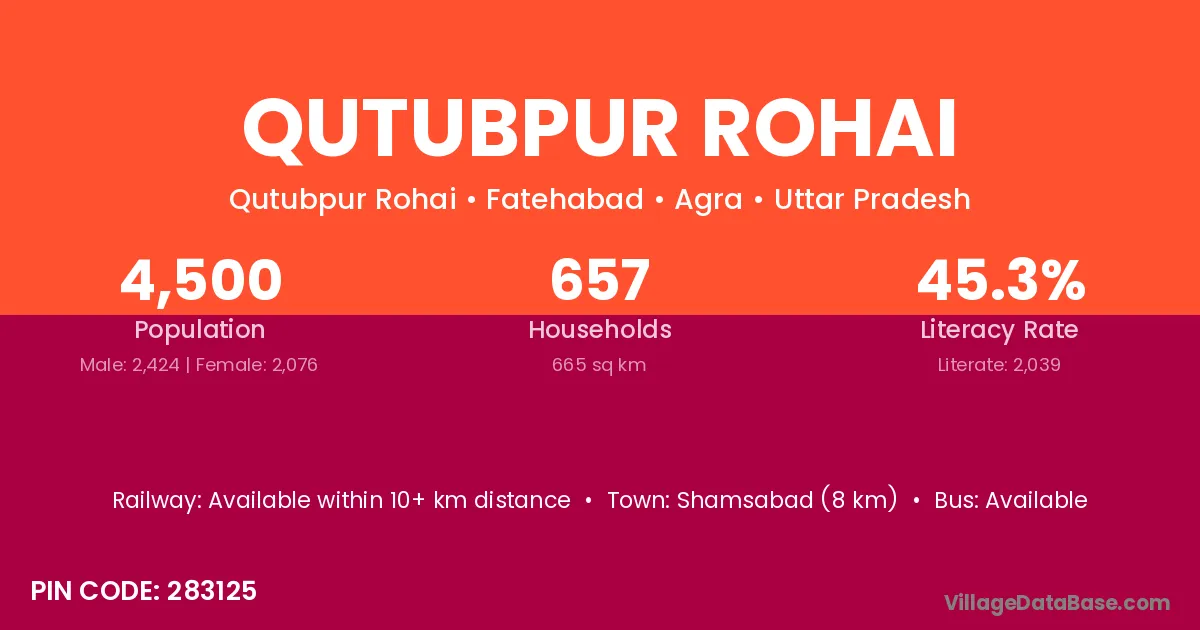 Shamsabad (8 km) is the nearest town to Qutubpur Rohai village for major economic activities and is located approximately 8 km away.