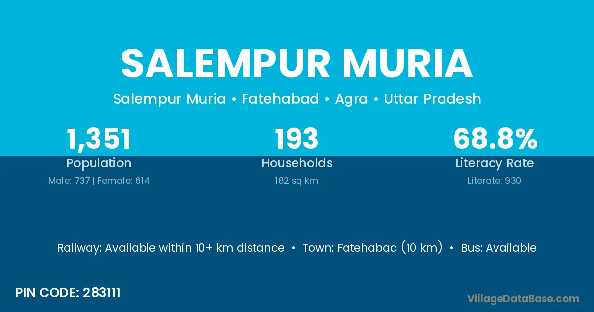 Fatehabad (10 km) is the nearest town to Salempur Muria village for major economic activities and is located approximately 10 km away.