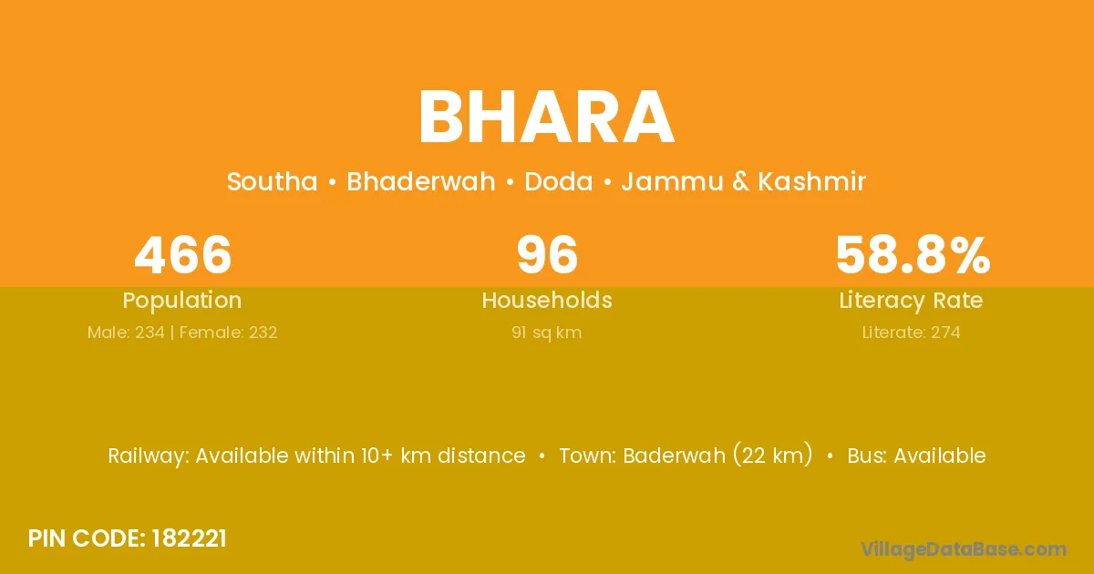 The literacy rate of Bhara village is 60.23%. Male literacy stands at 71.79% and female literacy at 46.21%.