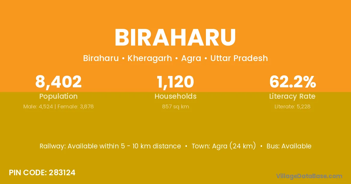 Agra (24 km) is the nearest town to Biraharu village for major economic activities and is located approximately 24 km away.