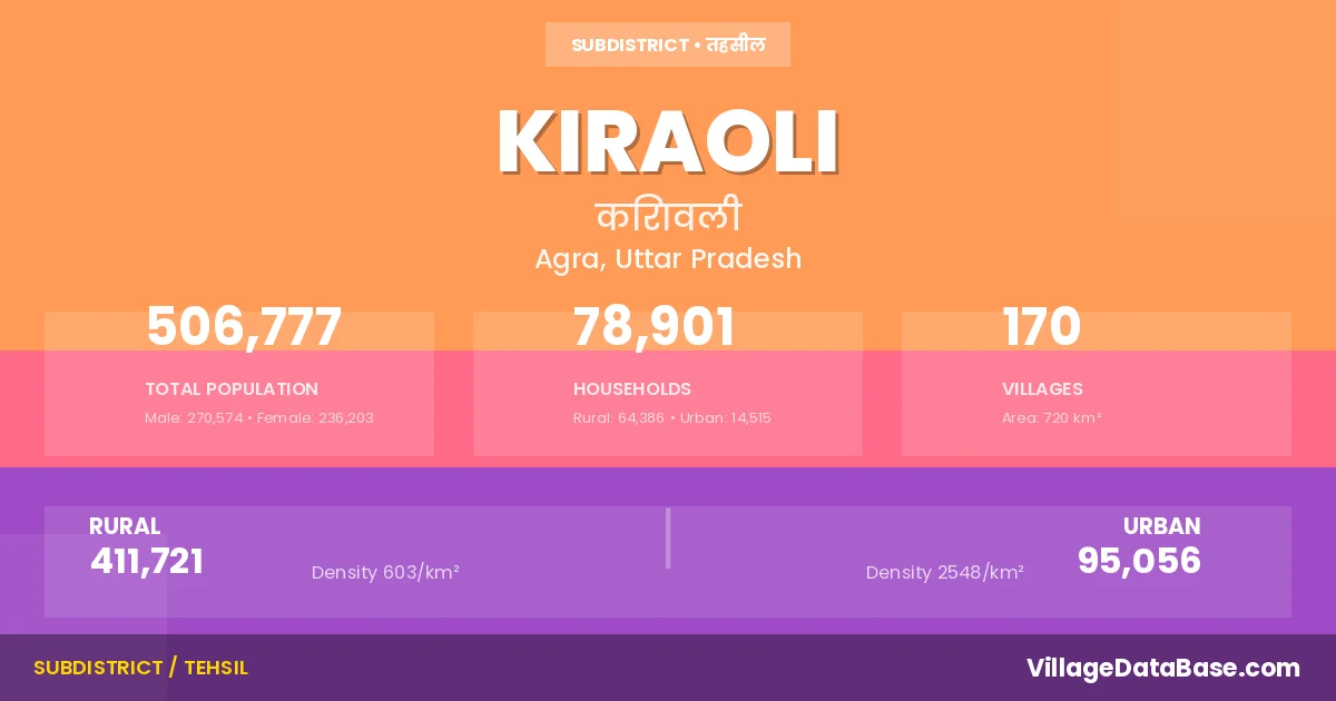 According to the 2011 census The total area of Kiraoli Tehsil is 720 km², with a population of 506777 people. The population density is 704 inhabitants per square kilometre, and there are approximately 78901 houses in the sub district.