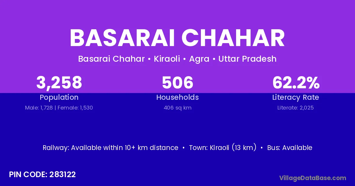 Kiraoli (13 km) is the nearest town to Basarai Chahar village for major economic activities and is located approximately 13 km away.