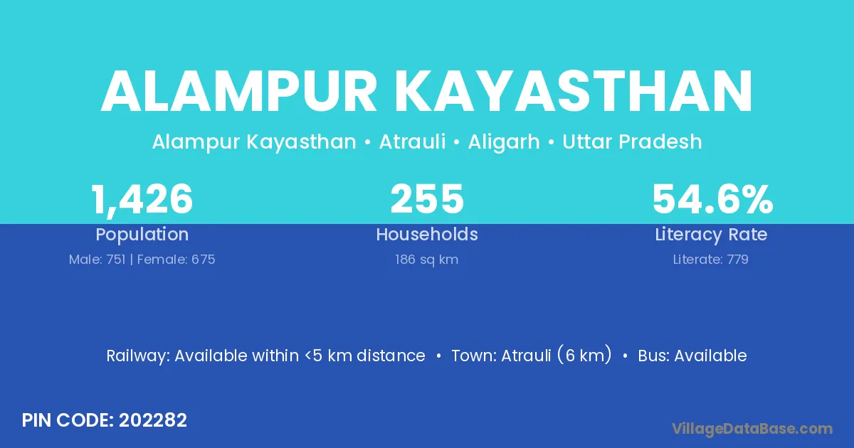 Atrauli (6 km) is the nearest town to Alampur Kayasthan village for major economic activities and is located approximately 6 km away.