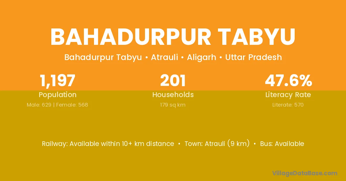 Atrauli (9 km) is the nearest town to Bahadurpur Tabyu village for major economic activities and is located approximately 9 km away.