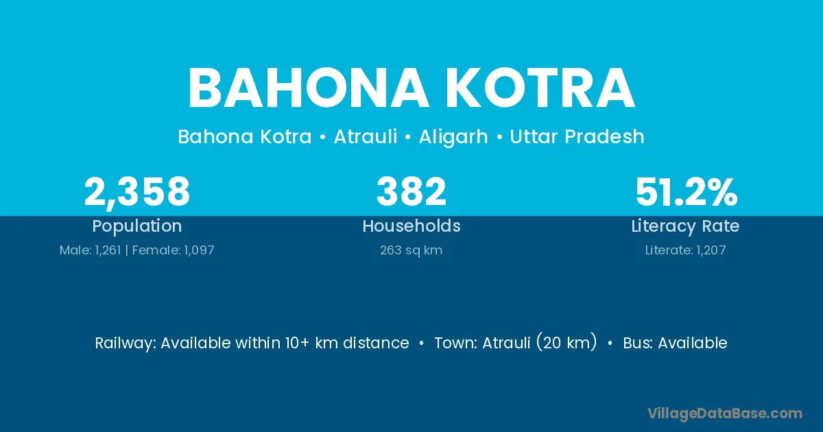 Atrauli (20 km) is the nearest town to Bahona Kotra village for major economic activities and is located approximately 20 km away.