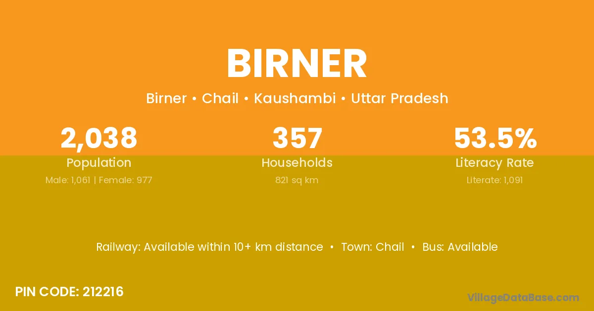 The literacy rate of Birner village is 54.82%. Male literacy stands at 65.90% and female literacy at 41.79%.