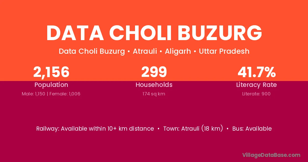 Atrauli (18 km) is the nearest town to Data Choli Buzurg village for major economic activities and is located approximately 18 km away.