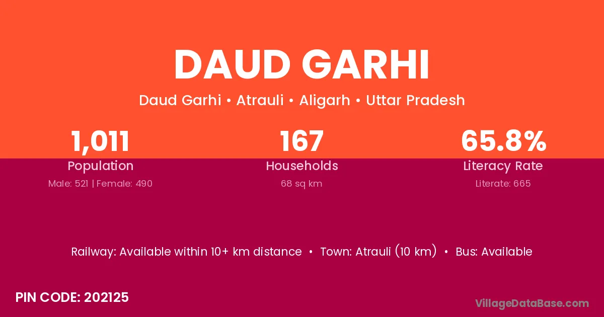 Atrauli (10 km) is the nearest town to Daud Garhi village for major economic activities and is located approximately 10 km away.
