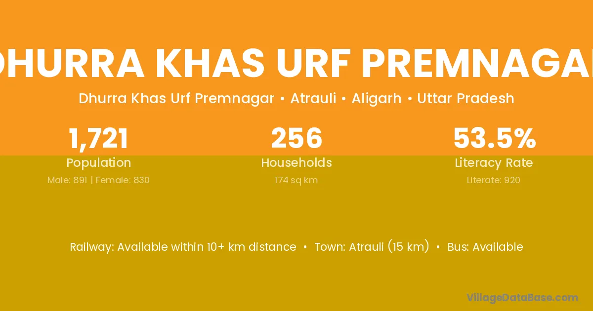 Atrauli (15 km) is the nearest town to Dhurra Khas Urf Premnagar village for major economic activities and is located approximately 15 km away.