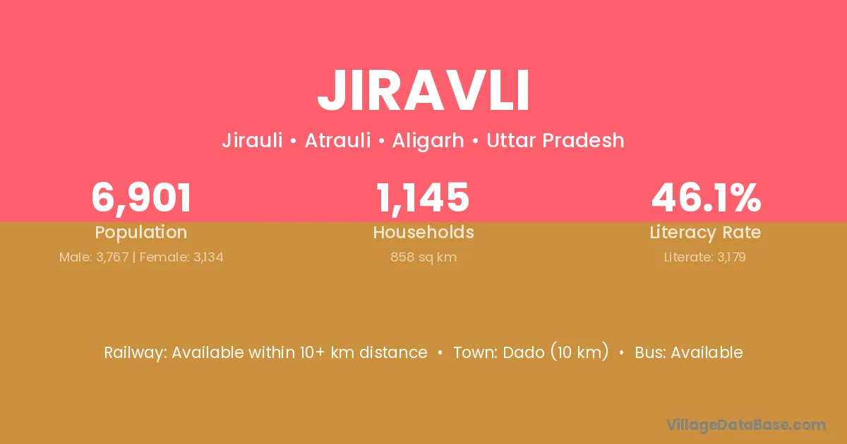 Jiravli village has a total population of 6,901 people, of which 3,767 are males and 3,134 are females.