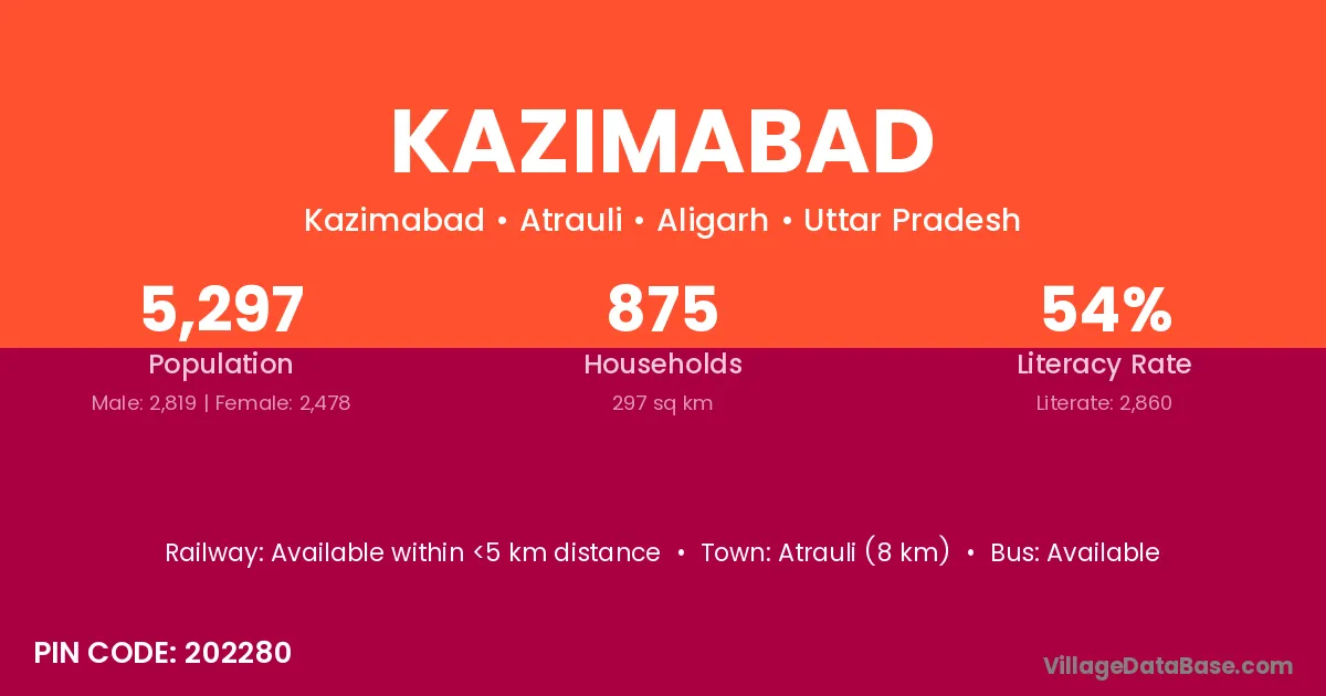 Atrauli (8 km) is the nearest town to Kazimabad village for major economic activities and is located approximately 8 km away.