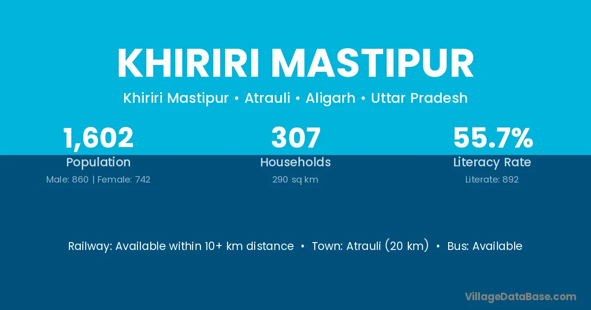 Atrauli (20 km) is the nearest town to Khiriri Mastipur village for major economic activities and is located approximately 20 km away.