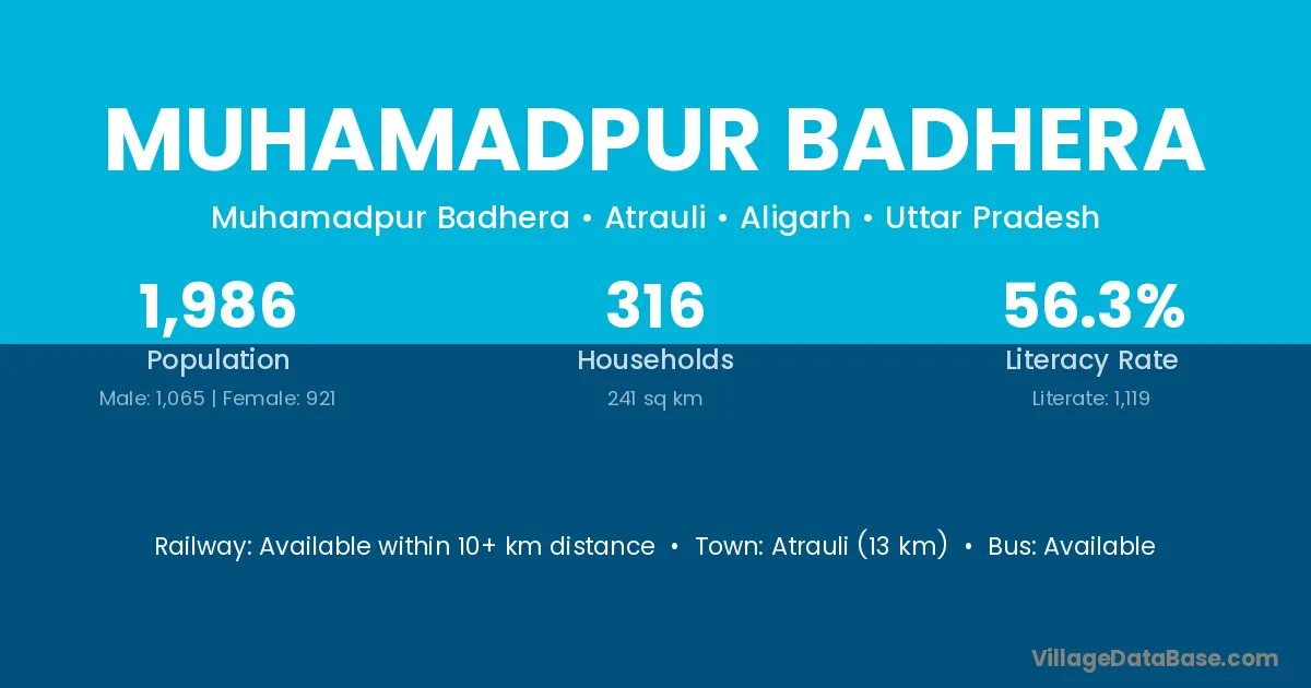 Atrauli (13 km) is the nearest town to Muhamadpur Badhera village for major economic activities and is located approximately 13 km away.