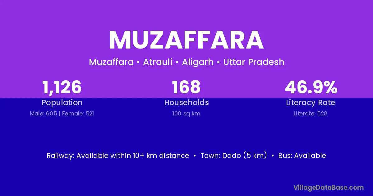 Dado (5 km) is the nearest town to Muzaffara village for major economic activities and is located approximately 5 km away.
